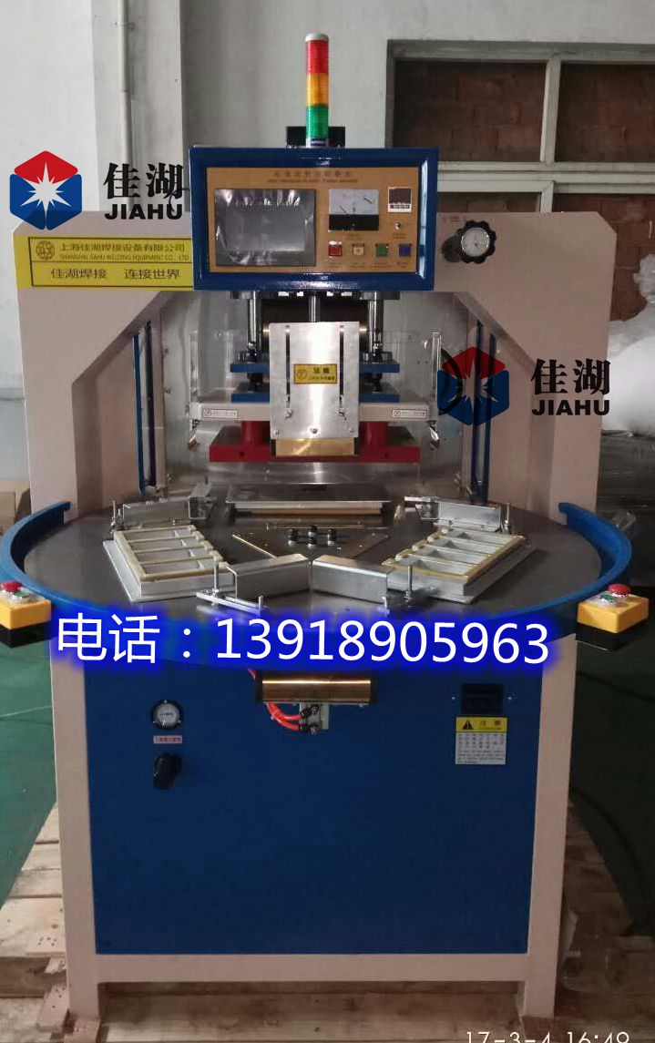 二、自動轉盤式高頻機特點: 1、多工位自動轉盤式高頻機有3~8工位,有標準型和PLC微電腦控制,多款機械根據客戶需求選擇供率大小,可根據客戶要求加裝熔斷功能,臺面大小,熔接次數,工位數選擇,自動放料系統和自動機械手自動取料等。 2、自動轉盤循環工作程序,采用分隔器和電機控制,工作穩定。 3、本機裝有高周回路,高周波輸出電力大,能使制品熔接,提高了生產產量。機器設有高周波頻率穩定器,以及高周波屏蔽裝置。將高頻干擾減少,避免電波干擾。使模具和物料損壞減少。