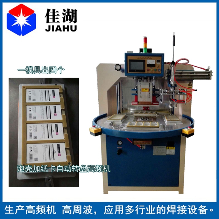 2.自動轉盤式高頻機又簡稱高周波:主要用于含30%以上各種聚氯乙烯(PVC)為主的塑膠熔接、焊接等,并將不同形狀泡罩或泡殼塑膠材質自動焊接同時自動切邊。適用于雙面吸塑焊接,吸塑泡殼與紙卡封合,吸塑包裝(包括上下雙泡罩熱合切邊,泡罩與紙板熱合),各種凹凸形狀的花紋圖案、字母文字的壓制等。全自動轉盤,焊接速度快,可選配帶機械手自動取料。