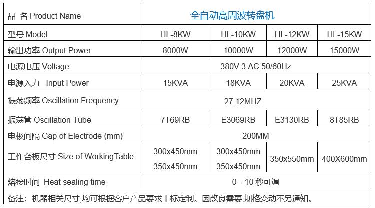 高周波機規格參數: