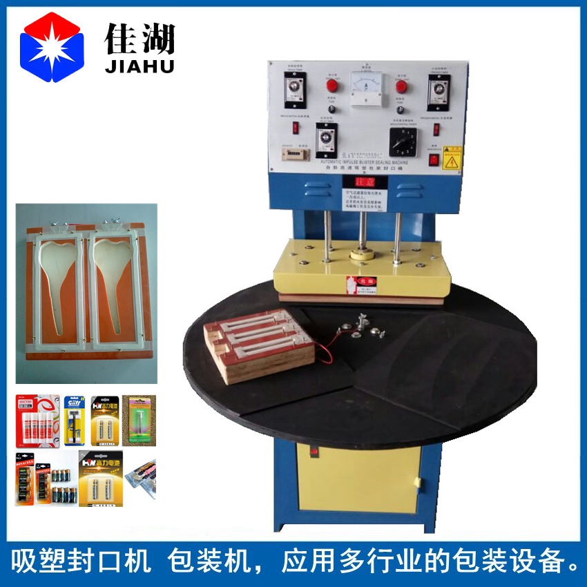 自動轉盤式封口機主要用于吸塑泡殼與紙卡的熱合包裝,利用脈沖發熱原理(36V電壓使電木模具發熱)根據工件大小(熱合面積)選擇不同電流輸出及通電時間 ,然后在加壓冷卻后情況下完成熱合包裝。