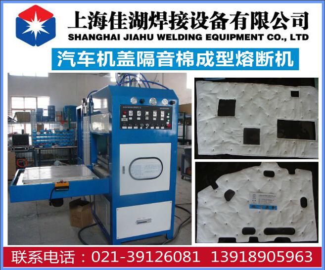 該設備為吸音棉定做。是由左,右自動滑臺進料,自動熔接,切斷,定型,自動退出,工作時通過滑臺輸送材料,進入工模位置,機頭氣缸自動下降,通過延時預熱,熔接、定型(切斷)、機頭上升、滑臺自動退出,手工取出成品。