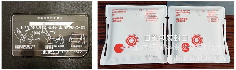 適用于PVC、TPU塑膠熔接或含30%PVC混合塑膠材料均可加工焊接、熔接、熱合、封口如識別帶、TPU腰托氣囊焊接、PVC卷簾門、包裝袋、紀念幣封套 、PVC束線 、吹氣玩具、文具袋、塑料封面、箱包旅游用品、皮革壓字.壓花.壓痕,反晶格、反光貼、反光膜熱合、救生衣氣嘴、漂流艇、 PVC線束、水囊、熱水袋、鞋面壓花等裝上簡單裝置還可進行燙金加工等。