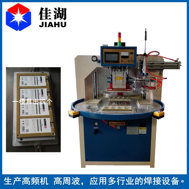 1.高周波自動轉盤式高周波機的用途:利用高頻熱合的原理,通過高周波模具加熱工件,到達塑料同塑料的熔接、塑膠同紙卡,或紙卡同紙卡的塑接,被熔接的紙卡通常在印刷時表面被涂上一層PVC或APET、PETG的膠水,在高周波的作用下熔為一體。