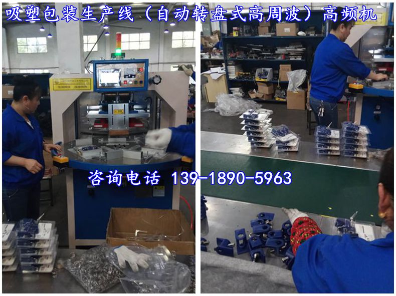 客戶流水線配套生產(chǎn)吸塑包裝采用佳湖多工位自動轉(zhuǎn)盤式高頻機