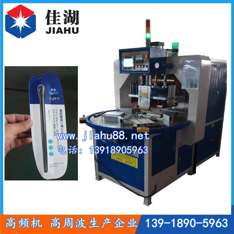 上海佳湖采用大轉(zhuǎn)盤多工位式,多工位自動轉(zhuǎn)盤式高頻機(jī)有3~8工位,配有標(biāo)準(zhǔn)型和PLC微電腦控制,采用機(jī)械手放料取料。