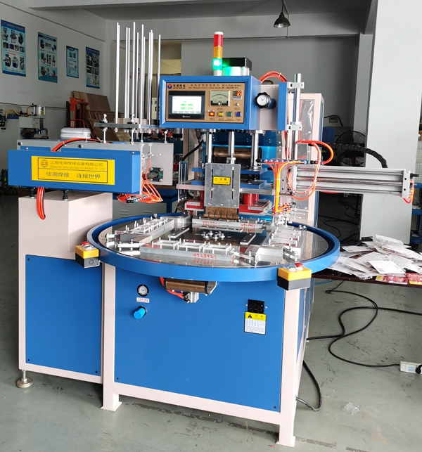 佳湖包裝企業的生產要求以及成本控制,生產一款全自動多工位轉盤高周波機。轉盤式高周波機有3個工位,4個工位,5個工位,6個工位,這個可以按客戶要求來定制。一般現在標準都是3工位和4工位,每個工位都能獨立完成產品,機械手放料自動取料。