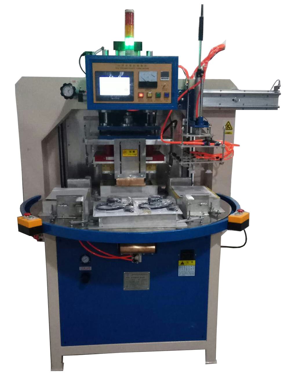 高周波 高周波熔接機有多種規格型號:上海佳湖廠家有全自動轉盤式高周波帶機械放料(機械手自動取料)速度快節省人工成本,適合產量大的用戶,自動轉盤式高周波 滑臺式高周波 雙頭氣動式高周波,不同產品選用不同的設備。