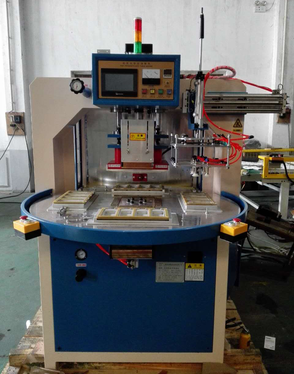 高周波熔接機主要用于含30%以上各種聚氯乙烯(PVC)為主的塑膠熔接、焊接等,并將不同形狀泡罩或泡殼塑膠材質(zhì)自動焊接同時自動切邊。適用于雙面吸塑焊接,吸塑泡殼與紙卡封合,吸塑包裝(包括上下雙泡罩熱合切邊,泡罩與紙板熱合),各種凹凸形狀的花紋圖案、字母文字的壓制等。全自動轉盤,焊接速度快,適用于大批量紙卡泡殼之間的焊接。可選配帶機械手自動取料,節(jié)省人力。